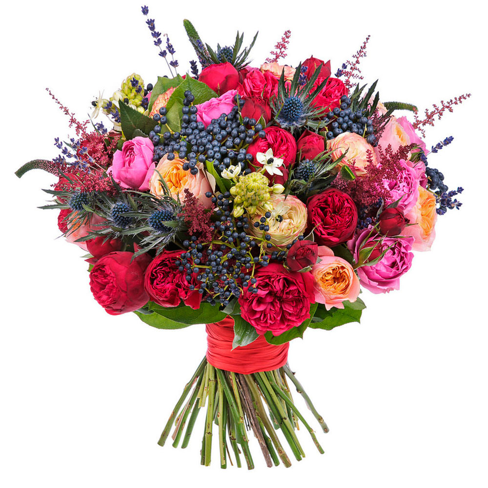 Эрингиум, розы пионовидные, роза кустовая, лаванда, астильба, орнитогалум, вибурнум.