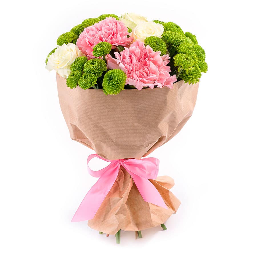 Хризантема кустовая, роза белая, гвоздика.